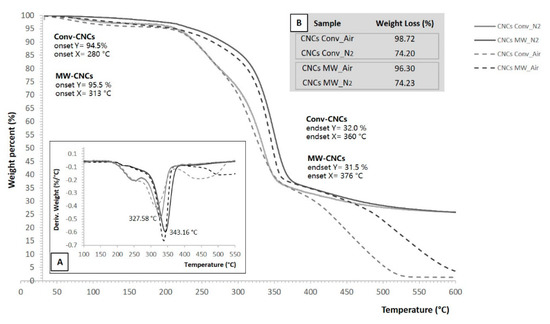 Interestingly, in comparison with conventional nanocrystal samples, microwave CNCs exhibited higher thermal stability for all phases of thermal decomposition. The onset degradation temperature (Tdonset), obtained from TGA curves, was a few tens of degrees lower for conventional nanocrystals (event shown in Figure 9). It could be appreciably observed, from the thermograms, that increments of 47.82 (ΔTd15) and 29.78 °C (ΔTd30) occur in the MW CNCs at the temperature corresponding to the 15% and 30% weight loss, respectively. Likewise, the value of Td60 for conventional nanocrystals weakly decreased to about 347.62 °C, compared with 367.19 °C of MW crystals (ΔTd60 = 19.57 °C). The endset (Tdendset) and the temperature of maximum degradation rate (Tvmax) (deduced by peak calculation of the first derivative of the weight loss curve), in N2 atmosphere, were also shifted to a higher temperature, from 360 to 375 °C and from 327.58 to 343.16 °C, respectively, in the case of MW CNCs. The difference in thermal degradation behaviour could be justified by the presence of a higher carboxyl content on the conventional CNCs surface, which is supported by the FT-IR spectra. Finally, heating in air induced a significant decline in the decomposition profile, leaving significantly lower final residues, nearly 4% and 1.3% (Figure 9 inset B), than those of nitrogen atmosphere, around 26%.