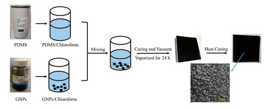 We elaborated the fabrication process of GNP/PDMS nanocomposites in Figure 1. In this study, the nanofillers were uniformly dispersed in a high-viscosity PDMS base polymer using volatile chloroform (Samchun, Seoul, Korea). For the detailed method, the GNP powder was first added to chloroform, then stirred for 0.5 h to sufficiently disperse the nanofiller. PDMS was diluted with chloroform at a 1:1 ratio and stirred for 0.5 h to lower its viscosity, which promoted uniform dispersion of the filler. The diluted PDMS was added to the GNP suspension, and the mixture was stirred for an additional 0.5 h. A curing agent (PDMS to curing agent mass ratio of 10:1) was then dripped into the mixture and stirred for 0.5 h. The mixed solution was evacuated in a vacuum box and placed on a glass substrate at room temperature all day to completely evaporate chloroform so as not to affect the final properties of GPN/PDMS. Finally, we made the cured the mixture at 100 °C for 0.5 h in the oven. After obtaining the film, we observed the dispersion of graphene inside the film by means of electron microscope scanning, as shown in Figure 1. Graphene was uniformly dispersed in PDMS.