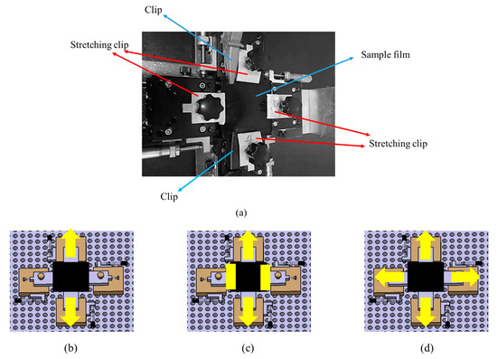(a) Biaxial stretching fixture. (b) First stretching method. (c) Second stretching method. (d) Third stretching method.