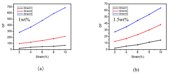 At the same time, we also performed three kinds of stretching on the film of 1.5 wt. %. As Figure 5b shows, the GF value of the film changed from 2.08 to 14.46 during uniaxial stretching. The GF value of the second stretch state increased from 12.24 to 38.18. In the third stretch condition, the GF value of the film increased from 26.97 to 63.75. In the case of biaxial stretch, the GF value of 1.5 wt. % film did not reach an order of magnitude higher than the GF value of uniaxial stretch, but it was also five times higher than that of uniaxial stretch.
