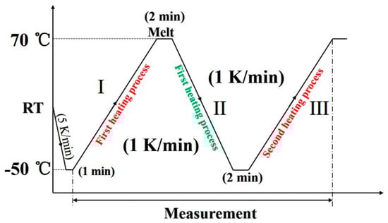 An X-ray diffractometer RINT-TTR III (Rigaku, Tokyo, Japan) was used for the simultaneous measurements of WAXD and DSC. The temperature was controlled by a heater and liquid nitrogen gas system. The X-ray beam used was Cu-Kα radiation (λ = 1.5418 Å) with an X-ray generator power of 50 kV and 300 mA. The X-ray diffraction profiles were measured in the 2θ range of 17°–26°, and scan speed was 15°/min. The thermal program employed is depicted in Figure 1. The diffraction profiles with every one degree were obtained.