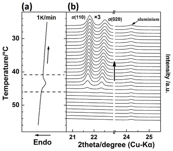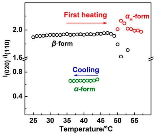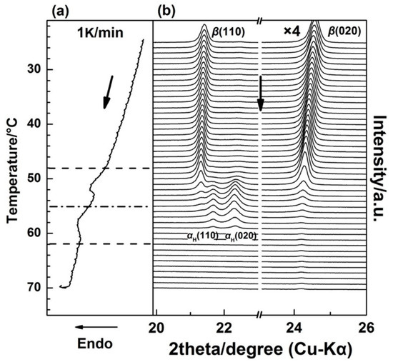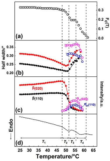 By Gaussian curve fitting of the diffraction profiles in Figure 2, the evolution of the half-width and intensity of the β(110), β(020), αH(110), and αH(020) peaks during the first heating process were achieved and shown in Figure 4, where the DSC profile is also shown. Fc(T) in Figure 4 is the function of the apparent crystallinity, which is defined on the basis of the following concept [34] and equation: