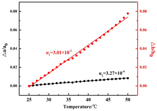 Temperature dependences of Δa/a0 and Δb/b0 for PBA as-cast film during the first heating process, where a0 and b0 are the lattice parameters of the PBA β form at 25 °C, and Δa and Δb are the difference between a(T) and a0 and b(T) and b0.