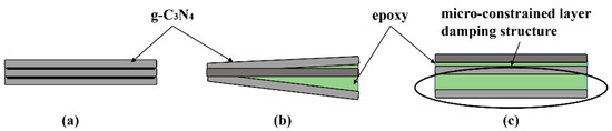 The loss factor characterizes the damping properties of materials. In our experiments, the loss factors were also investigated in the mode of step temperature multi-frequency scanning and the influence of temperature on loss factor can be neglected in the test range. As shown in Figure 12, the loss factors of the nanocomposites increase significantly with the increased g-C3N4 loading and the maximum value is obtained at 3 wt.% loading. The loss factor of EP-CN3.0 under the excitation frequency of 1 Hz at 30 °C increased from 0.035 to 0.049. It is generally believed that the energy dissipation originated from interfacial friction is the main reason for the enhancement of damping properties of nanocomposites. However, the strong interfacial interaction between g-C3N4 and matrix means the critical interfacial shear strength could be relatively high and the interfacial slip is not easy to occur. Nevertheless, the loss factor of nanocomposites has been significantly improved, which indicates the existence of other forms of energy dissipation. Moreover, it is possible that the increased loss factors are related to the multiscale laminated structure of g-C3N4. The multiscale nanoparticles exhibited both fully dispersed and insufficiently dispersed states in the matrix. In the state of fully dispersed, most of the particles existed in the form of non-oriented single nanosheet, while in the state of insufficiently dispersed the existence of stacked structures in the matrix can be divided into three situations, as shown in Figure 13: (a) the original structure had not been changed at all; (b) the interlayer interface had been partially separated; (c) the interlayer interface had been completely separated, but the stacking structure is still maintained. In the case of b and c, the micro-constrained layer damping structure was formed by epoxy matrix entered into the separated layers and energy dissipation was realized by shear deformation of the matrix entering the interlayer. In situation a, the friction caused by the relative slip between nanosheets is the principal source of energy dissipation. The study of Shi [28] indicated that there were a large number of hydrogen bonds between layers of g-C3N4. Therefore, in addition to interfacial friction, the reversible cycle of breakage and re-established of hydrogen bond (Figure 5) between layers could also generate energy dissipation. On the whole, we believed that the damping enhancement of g-C3N4 reinforced epoxy nanocomposites may be the result of a combination of above energy dissipation modes. Another point worth noting is the peculiar change with a loading of 5 wt.% which might be related to the gradual deterioration of the interface between agglomerates and matrix. As the dimension of the agglomerates became larger, they were more difficult to be fully infiltrated, then more defects such as voids in the inner part of the agglomerates and gaps in the interface were formed in the nanocomposites, which had been proved to have a positive effect on energy dissipation. In addition, the loss factor of nanocomposites increases with frequency, which is in accordance with the established relationship between the frequency and loss factor [48].
