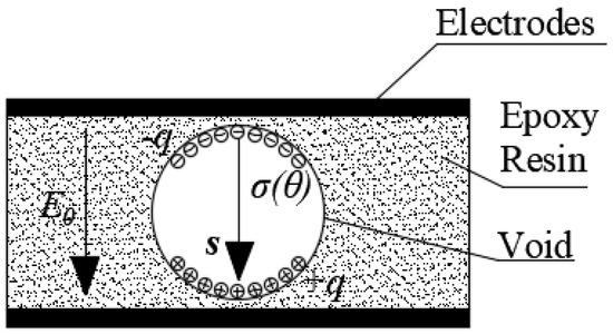 where and are the solutions at each side of the interface between void, , and dielectric material, , and is the normal direction to the interface. After a PD event, the spatial charge deployed on the void surface produces a field, a Poisson field, that opposes the electrostatic field produced by electrodes in the dielectric material, a Laplacian field [62]. In addition, the total charge in the void must remain zero, giving rise to the appearance of a dipole moment as is shown in Figure 1.