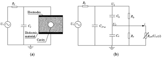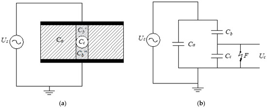 In Figure 3, (F) is the capacitance of the bulk of dielectric material, (F) is the equivalent capacitance of dielectric column in series with the void, resultant from , and (F) is the capacitance of the void which is short-circuited by the spark gap