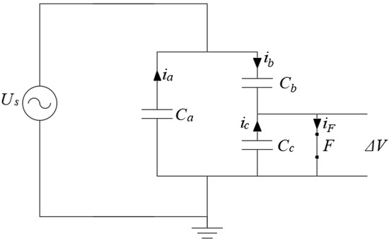 Three-capacitance model representation during a PD event. When a PD occurs, Cc is short-circuited by the spark gap F and a transient current will flow. In addition, voltages will be modified by the transient phenomenon.
