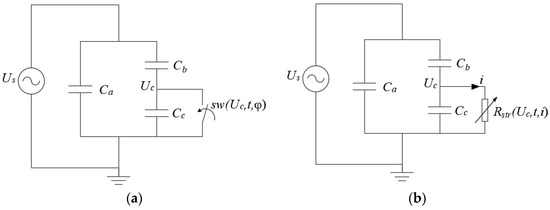 The three-capacitance model was initially proposed by Gemant and Philippoff in 1932 for estimating the power losses in power cables due to discharges in voids [74]. They made experimental measurements and found that the PD rate was in good agreement with theoretical calculations using the equivalent circuit [61]. In 1951, Whitehead proposed the modified equivalent circuit shown in Figure 3, usually known as the “abc” model [75]. This circuit allows calculating a numerical relationship between the charge in the measurement circuit and the internal charge in the cavity.