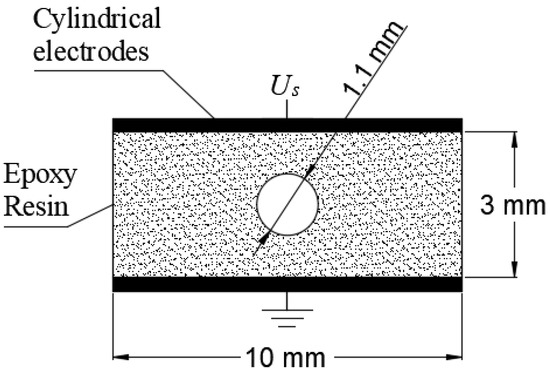 where (V·m−1) is the inception electric field strength magnitude, , B and n are parameters related to the ionization process in gases and depend on each specific gas, for example, in air the values are, respectively, 24.2 V·Pa−1, 8.6 Pa1/2·m1/2 and 0.5. On the other hand, p is the pressure in Pa and a is the radius of the void in m. Although Equation (1) was determined in a configuration different to a gas filled void surrounded by a solid dielectric, Callender [16] found that shows good agreement with advanced plasma models and experimental values.