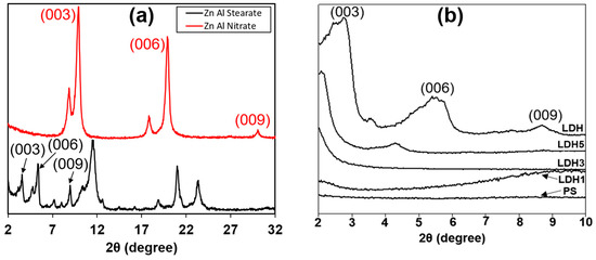 X-ray diffraction patterns of (a) Zn Al stearate and Zn Al Nitrate showed the changes in the d-spacing, due to stearate penetration into the galleries and (b) the unfoamed polystyrene (PS) and PS-LDH nanocomposites demonstrating the interactions between the PS and stearate-LDH leading to intercalation and exfoliation of the layers.