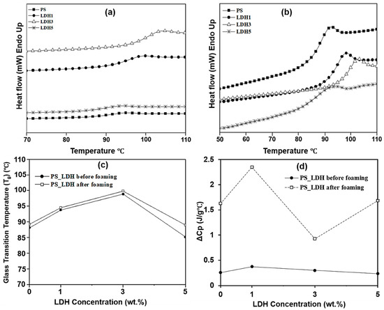 First heating curves from differential scanning calorimeter (DSC) analysis for (a) unfoamed and (b) foamed PS and PS_LDH nanocomposites and the effect of ScCO2 on the (c) glass transition temperature and (d) change in enthalpy with respect to LDH concentration.