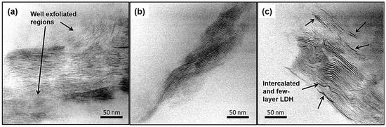 TEM was used to observe the dispersion of the LDH in PS. It can be seen that there is good dispersion (exfoliation) in LDH1 and LDH3, but some agglomeration in LDH5 (Figure 4). The presence of thicker lines in LDH5 represent layers of platelets which are not exfoliated, as pointed out by the arrows. This result is in correlation with those from the XRD and supports the results obtained from foam morphology and characterization. As stated earlier, the high loading of LDH in LDH5 resulted in incomplete exfoliation or more intercalated layers, subsequently resulting in reduced wetting by the matrix, larger voids at interfaces, and increased and larger nucleation sites. As a result of the larger nucleating sites, there was an increased cell size, reduced foam density, and exfoliation within the matrix in LDH5.