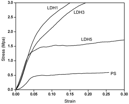The stress-strain plot of the compression test of the foamed nanocomposites is shown in Figure 5. It can clearly be observed that the addition of LDH to PS significantly increases the compressive properties. Relative to our previous work using MLS [15] at the same filler concentration, the modulus was found to be 19.84 MPa (MLS1), whereas LDH1, in this case, ne with fur was at 41.44 MPa. The compressive strength of the LDH1 is 300% that of the MLS1. The improvement observed in LDH1 can be attributed to the stearate functionalization of the LDH. Strong mechanical interlocking between the exfoliated LDH stemming from the attached stearate molecule improves the interfacial adhesion with the PS. Likewise, well-dispersed LDH in the PS can be attributed to increased hydrophobic-hydrophobic interactions between the stearate on the LDH and the PS, as seen from the XRD patterns of the samples. All of these contribute to improvements in mechanical performance.