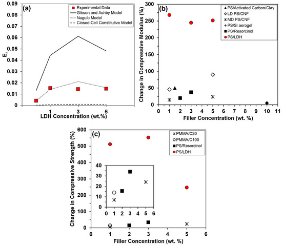 Graphical representation comparing (a) relative modulus (Er) models to experimentally determined data as a function of the LDH concentration and benchmarking the percentage increase in (b) compressive modulus and (c) compressive strength of experimental data against PS composites from in the literature, due to incorporation of fillers [31,35,36,37].