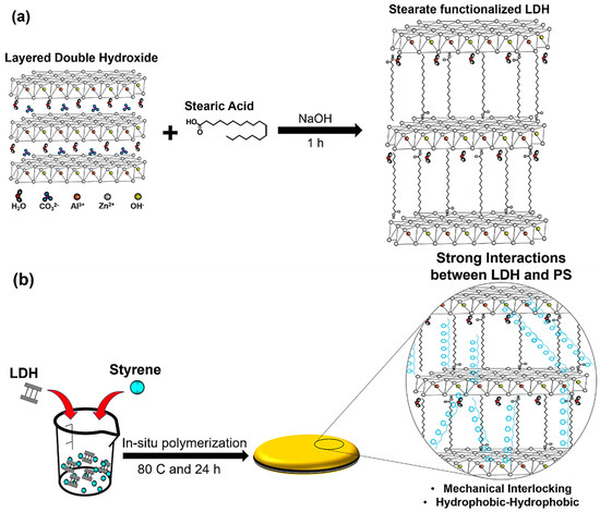 Illustration showing (a) the functionalization of layered double hydroxide (LDH) using stearic acid resulting in an increase of the interlayer d-spacing of the LDH and hydrophobicity, and (b) in-situ polymerization of polystyrene-layered double hydroxide (LDH1, LDH3 and LDH5) nanocomposites showing strong interactions through hydrophobic-hydrophobic and mechanical interlocking.