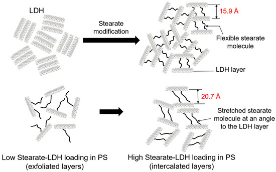 This remarkable multi-fold enhancements in comparison to literature can plausibly be attributed to increasing in d-spacing of the LDH by the stearate, allowing for the PS chains to mechanically interlock during in situ polymerization and the hydrophobic-hydrophobic interaction between the PS chains and the stearate in the LDH, as seen in the illustration in Scheme 1.