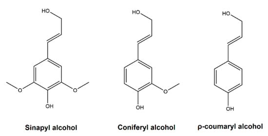 Chemically, lignin is a highly branched, amorphous biomacromolecule that normally presents molecular masses between 1000 and 20,000 g/mol. At present, it does not exist a defined lignin structure, since the determination of the lignin structure is extremely complex. The structure of lignin is constituted by different structures and repeated units, which depend on the species, location, growth duration of the plant, and the extraction process used to separate it from cellulose and hemicellulose. However, it is known that the structure of the lignin, regardless the plant and the extraction process, is composed mainly of three different phenylpropane monomers called sinapyl alcohol, coniferyl alcohol, and ρ-coumaryl alcohol [] which give rise to units of p’-hydroxyphenyl (H), guaiacyl (G) and syringyl (S). Figure 1 shows the three monolignols that are considered the building blocks of lignin.