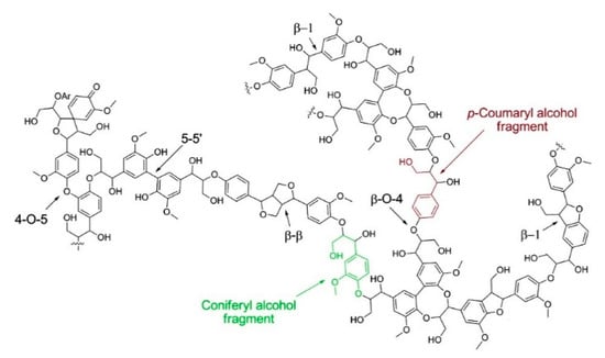 These subunits contain many different functional groups, such as hydroxyls (20% to 30%), carbonyls (20%) and methoxyls (90%–95%), which are active sites for further chemical modification of lignin []. Figure 2 shows the structure of lignin from softwood.