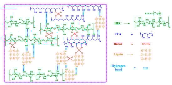 The abundant polar sites on lignin’s backbone can be also employed for physical crosslinking of hydrophilic polymers by H-bonding. This was the case of the hydrogels prepared for Oveissi et al. [] in which lignin was added to polyurethane hydrogels and it was confirmed that hydrogen bonding led to improve the mechanical properties and the processability of the final hydrogels, while swelling properties remained similar. H-bonding were also established on hydroxyethyl cellulose (HEC) and polyvinyl alcohol (PVA) hydrogels physically crosslinked with borax, between lignin and cited polymers (Figure 3). Lignin uniformly dispersed within the network showed to act as plasticizer, increasing polymer chains mobility and consequently, leading to high stretchability []. Hydrogels showed self-healing capability due to the dynamic hydrogen bonding between HEC, lignin, PVA, and reversible diol-borax complexation.
