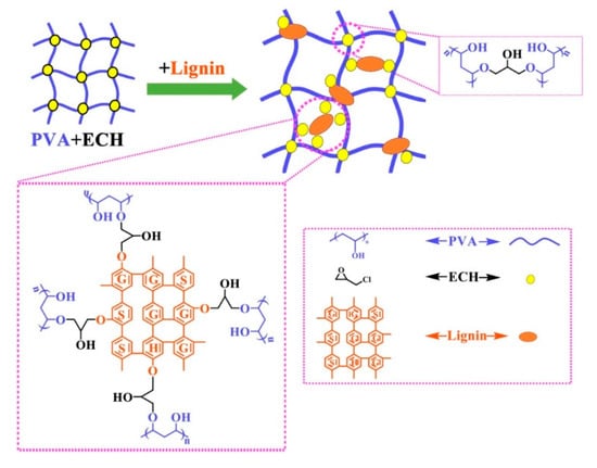 Schematic representation of the preparation of PVA/lignin hydrogels crosslinked with epychlorhydrin. Reproduced with permission from Wu et al. []. Copyright © (2019) Elsevier.