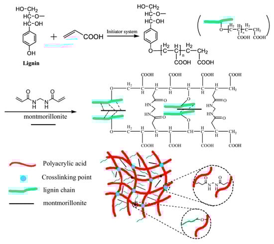 Schematic representation of the synthesis of hybrid hydrogels of lignin/PAA/montmorillonite crosslinked in the presence of NMBA. Reproduced with permission from Sun et al. []. Copyright © (2019) Elsevier.