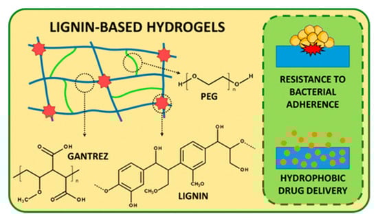 Representation of the synthetic procedure for the preparation of lignin/poly(methyl vinyl ether co-maleic acid) hydrogels crosslinked by PEG. Hydrogels showed diminished bacterial adhesion and capability for the controlled release of hydrophobic drugs. Reproduced with permission from Larrañeta et al. []. Copyright © (2019) American Chemical Society.