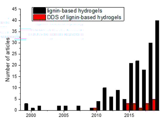 Lignin is well-known for being inexpensive and sustainable, but when it comes to its potential in biomedical applications it is important to notice its antioxidant properties, non-toxicity, antifungal, and antibacterial properties []. The swelling capacity of hydrogels as a response to a trigger stimulus could be a highly desirable property to design drug delivery systems (DDS) capable to release an active agent in a concrete medium. Considering the intrinsic biological properties and the swelling capacity of lignin-based hydrogels, several DDS have been reported until now and the number of the articles devoted to this are increases every year (Figure 12).