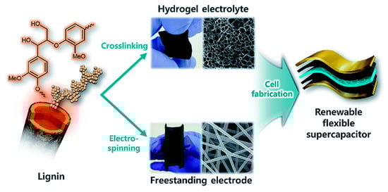 - Park, J.H.; Rana, H.H.; Lee, J.Y.; Park, H.S. Renewable flexible supercapacitors based on all-lignin-based hydrogel electrolytes and nanofiber electrodes. J. Mater. Chem. A 2019, 7, 16962–16968. [Google Scholar] [CrossRef]