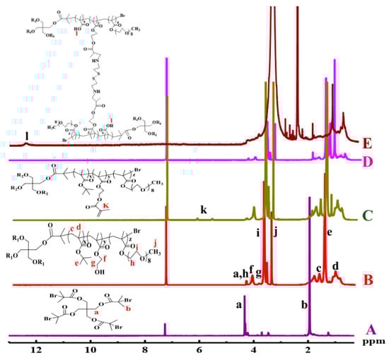 1H NMR spectra of (A) Br4, (B) 4AS-PtBMA-PHEMA-PPEGMA, (C) 4AS-PtBMA-(PHEMA-A)-PPEGMA, and (D) 4AS-PtBMA-(PHEMA-SS~)-PPEGMA in CDCl3, and (E) 4AS-PMAA-(PHEMA-SS~)-PPEGMA in DMSO-d6.
