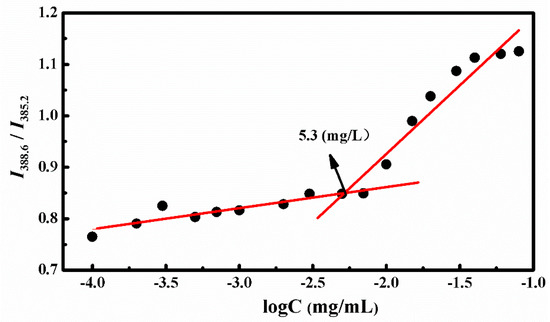The amphiphilic star copolymer can be self-assembled into three layers of SCMs in aqueous solution when the concentration reached the critical micelle concentration (CMC) value. The CMC was obtained by the fluorescence technique with pyrene as the probe. Since the pyrene probe could migrated from the aqueous solution to the hydrophobic core of the micelles while increasing the copolymer concentration, we measured the emission spectra of polymer/pyrene solution and received the changes of the peak from 385.2 to 388.6 nm at an excitation wavelength of 340 nm. Figure 2 showed the ratios of I388.6 to I385.2 against different polymer concentrations, and the interception of two straight lines was CMC, which was valued at 5.3 mg/L. This suggested that the amphiphilic polymers could self-assemble into stable micelles even at low concentrations.