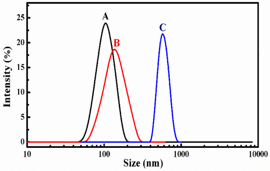 Size distribution of blank SCMs: (A) before, (B) after 1000-fold water, and (C) four-fold DMF dilution.