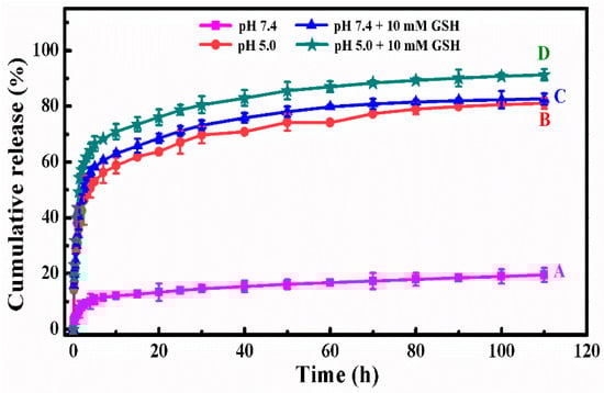 The in vitro DOX release profiles of DOX-loaded SCMs at different simulated conditions: (A) pH 7.4, (B) pH 5.0, (C) pH 7.4 + 10 mM GSH, and (D) pH 5.0 + 10 mM GSH.