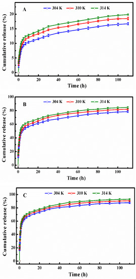 The in vitro DOX release profiles of DOX-loaded SCMs at the temperatures of 304, 310, and 314 K under different simulated conditions: (A) pH 7.4, (B) pH 5.0, and (C) pH 5.0 + 10 mM.
