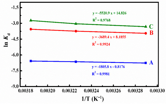 The plots of ln Kd versus 1/T at different simulated conditions: (A) pH 7.4, (B) pH 5.0, and (C) pH 5.0 + 10 mM.