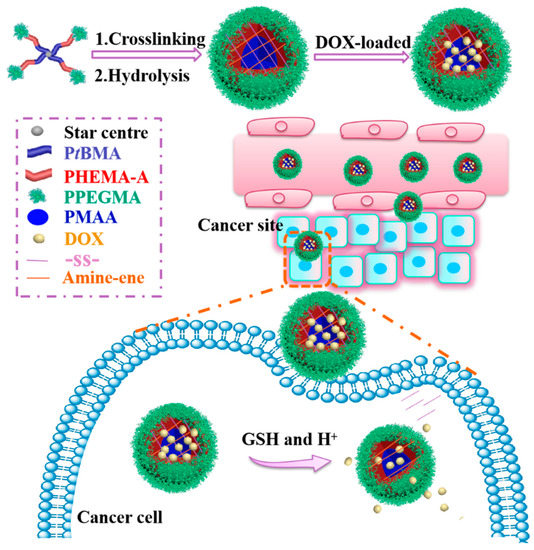 Polymer micelles have shown their attractive advantages as anti-cancer nanocarriers for anti-cancer drugs and attracted more attention in recent years [1,2,3,4]. With the unique core-shell nanostructures, polymer micelles can enhance water solubility, raise drug-loaded capacity, reduce protein adsorption, prolong circulation duration, and increase drug accumulation at target sites and more [5,6,7,8,9]. However, there usually existed two weaknesses of traditional micellar systems. One is the premature drug release in bloodstream and normal tissues, and the other is the slow and incomplete drug release within cancer cells. These two weaknesses increase side-effects, shorten drug effective time, and reduce therapeutic efficacy.