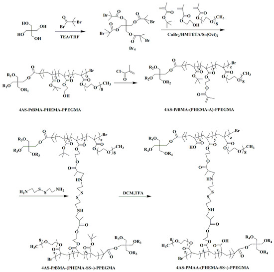 The copolymer 4AS-PMAA-(PHEMA-SS~)-PPEGMA was synthesized using the combination of ARGET ATRP, Michael addition reaction, and hydrolysis method (Scheme 2). In the first step, the functional initiator Br4 was obtained by using pentaerythritol reacted with 2-bromoisobutyryl bromide at 25 °C. Then, the ARGRT ATRP of tBMA, HEMA, and PEGMA proceeded successively with Br4 as the initiator, CuBr2/HMTETA as the catalyst system, and Sn(Oct)2 as a reducer to obtain 4AS-PtBMA-PHEMA-PPEGMA. Next, the cross-linker of cystamine dihydrochloride was introduced to build a cross-linked structure with the copolymer using the Michael addition reaction. Lastly, the copolymer 4AS-PMAA-(PHEMA-SS~)-PPEGMA was synthesized by hydrolysis to remove the tertiary butyl groups from tBMA units.