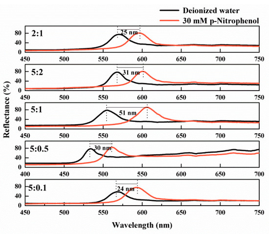 To obtain the optimal desired sensors for detecting PNP, the molar ratios of the functional monomer and crosslinker were exploited. Generally, when IOPPCs are fabricated with a lower ratio of crosslinker to functional monomer, they are more sensitive to the PNP [32]. However, when the concentration of the crosslinker is reduced below a certain level, not only is it difficult for the IOPPCs to maintain their 3D-ordered structure but also their flexibility is reduced. Thus, the proportions of functional monomer and crosslinker need to be balanced to obtain the most outstanding sensors [33]. Figure 2 shows IOPPCs fabricated with different ratios of HEMA and EGDMA responding to 30 mM PNP. It can be seen that the Bragg diffraction peak red shifted by 25, 31, 51, 30 and 24 nm when the molar ratios between the monomer and crosslinker were 2:1, 5:2, 5:1, 5:0.5, and 5:0.1, respectively. To this end, a 5:1 molar ratio of monomer to crosslinker was utilized when detecting PNP in this work.