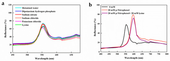 The interference immunity for other molecules is also a key factor in the evaluation of IOPPCs. In order to assess the detection ability of the IOPPCs deeply, several common compounds, namely, dipotassium hydrogen phosphate, sodium nitrite, sodium chloride, potassium chloride and lysine (all in 20 mM solution) were chosen to be analyzed by the IOPPCs under the same conditions. As shown in Figure 6a, other compounds almost caused no peak shifts. The reason for this is that IOPPCs are only highly sensitive to a special solution. The molecular structure of these reference compounds and the physicochemical properties of their aqueous solutions are different from those of PNP. As a consequence, they were not able to cause a response of the IOPPCs. Even when the interferents and PNP were detected together, the influence on the shift of the diffraction peak was very small (Figure 6b). For IOPPCs to have good sensitivity to pH and ionic concentration, high concentrations of H+ and OH− should be avoided in detection in case of interference.
