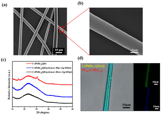 (a,b) SEM images of the CsPbBr3@PF8k-b-PBA12k fibers (1 g/400 μL). (c) XRD patterns of the CsPbBr3@PF8k-b-PBA12k fiber compared with CsPbBr3@PF8k-b-PBA12k and CsPbBr3 QD film. (d) Confocal image of the CsPbBr3 QDs@PF8k-b-PBA12k fibers.