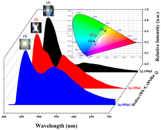 The color-tunable light down-converters were successfully fabricated using a single layer of CsPbBr3@PF8k-b-PBA12k composite fiber on a commercial UV chip (λmax = 380 nm) and commission internationale de l’eclairage (CIE) is illustrated in Figure 4. Furthermore, the color of the light down-converter can be controlled by varying the QD/polymer ratio by 1:100, 1:200, and 1:400 (1 g/400 μL) (Figure 4). The insets in Figure 4 display the light down-converter with different correlated color temperatures (CCTs), which correspond to the emission images. The emissive intensity of perovskite becomes weaker when the ratio decreases. In other words, the higher intensity at 550 nm on green-color-emission is observed with an increasing perovskite QD blending ratio. It is because of the obvious energy transfer (physical processes) from commercial UV LED chip (donor) and PF-block (donor) to perovskite QD (acceptor), which is similar to some papers [38,44]. In this way, the CCTs and color can turn from green to blue. It is a novel and simple method of controlling the color by blending perovskite in the polymer fiber.