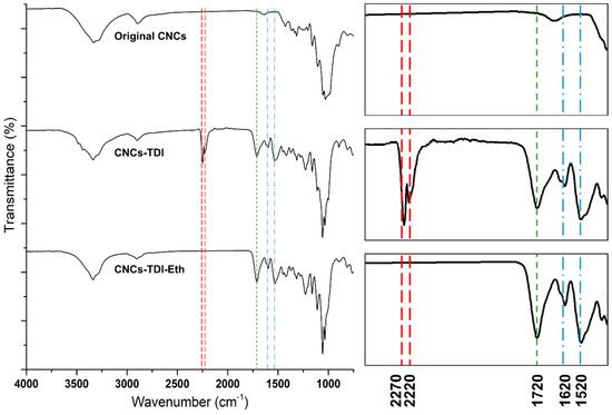 The TDI-carbamation and alcohol-grafting reactions were also monitored using FT-IR (Figure 2). The original CNCs showed the typical vibration bands of cellulose at 1110 cm−1 for glycosidic bond vibration, at 1430 cm−1 for C-H deformation vibration, at 1640 cm−1 for adsorbed water vibration, at 2890 cm−1 for C-H stretching vibration, and at 3300 cm−1 for O-H stretching vibration [46]. TDI-carbamation of the CNCs was evident by the appearance of the bands of the aromatic ring vibration at 1520 and 1620 cm−1, the stretching vibration of the carbonyl group of the urethane bond at 1720 cm−1, and the asymmetric isocyanate vibration at 2220 and 2270 cm−1 as TDI reacted with the surface of the CNCs forming a urethane bond. Upon grafting the alcohols on the CNC surface through the free isocyanates, the isocyanate vibration bands disappeared confirming their reaction with the alcohols. The intensity of the carbonyl stretching vibration band at 1720 cm−1 increased as grafting led to a further formation of urethane bonds.