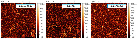 Any possible change in the morphology of the CNCs upon carbamation and grafting was investigated using AFM (Figure 3). The height images showed no significant change in the shape of the particles in general. No significant agglomeration, crosslinking, or even thickening was also observed. The thickness of CNCs-TDI and CNCs-TDI-Oct was respectively 8.0 ± 1.0 nm and 8.7 ± 1.3, which are slightly higher than that for the original CNCs (thickness of 7.0 ± 1.6 nm). This means that the thickness of the graft is not more than 1–2 nm.