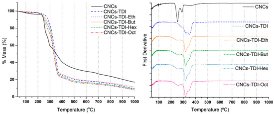 The impact of TDI-carbamation and alcohol-grafting on the thermal stability of the CNCs were investigated using TGA (Figure 4 and Table 2). A two-stage degradation was observed for the original CNCs, which is in line with the typical thermal behavior of the CNCs prepared using sulfuric acid. The degradation temperature was around 250 °C, which is lower than the typical degradation temperature of wood cellulose (350–400 °C) [47]. That is a result of the increase in the free end chains due to cellulose depolymerization during the production of the CNCs [48]. A relatively high char fraction of around 18% is a result of the sulfate groups acting as flame retardants [49]. These values are all in agreement with the reported values in the literature for CNCs [50]. Upon TDI-carbamation, the thermal stability of the CNCs changed significantly in the form of an increase in the degradation temperature to 351 °C and a decrease in the char fraction to 9.3%. The increase in the degradation temperature and onset is a result of derivatizing the less stable CNC hydroxyl groups by the TDI molecules [51] and the complete degradation of the surface TDI molecules could be the reason for the lower char fraction [52]. It is important to clarify that the two-stage degradation of the carbamated CNCs does not mean that the degradation mechanisms of the CNCs and carbamated CNCs are similar. Alcohol grafting made the degradation more heterogeneous in the form of a three-stage degradation. The second and third degradation stages for all alcohol-grafted CNCs took place at the same temperature as the first and second degradation stages of the carbamated CNCs (320 and 351 °C, respectively). This may imply that the first stage in the degradation of the alcohol-grafted CNCs is a result of the degradation of the grafted alcohol. Overall, the degradation temperature of the CNCs upon alcohol grafting decreased from 351 to around 320 °C while the char fraction did not change significantly.