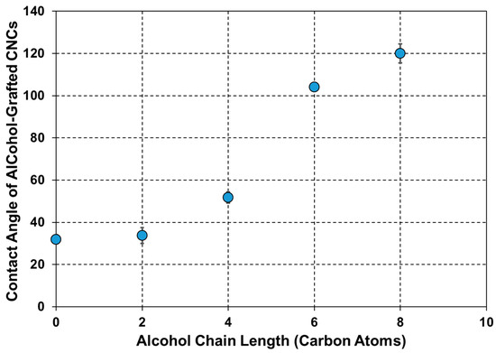 The dependence of the contact angle of the modified CNCs on the chain length of the alcohols grafted onto their surfaces.