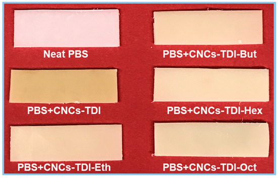 It is clear now that it is possible to tailor the surface properties of CNCs by grafting alcohols of different chain lengths onto their surfaces. The impact of this procedure on the interfacial adhesion between CNCs and PBS was investigated for films of 5% (w/w) CNCs in PBS (Figure 6 and Figure 7). No agglomeration of the CNCs can be observed visually or using SEM, indicating a good dispersibility of the CNCs within the PBS matrix, which was not possible to achieve using the original CNCs. However, a clear change in the color of PBS from white to off-white was observed, which was more significant for the PBS reinforced with CNCs-TDI. This change in color was not a result of any thermal degradation of the CNCs or PBS as the TGA results (Figure 4 and Table 3) showed that both materials (CNCs and PBS, separately) started to degrade at temperatures far higher than the temperature used for making the films (135 °C). No chemical reactions can be foreseen as a reason for this color change as the CNCs and PBS are expected to be chemically inert to each other. The only possible interaction between them is expected to be physical, in the form of adhesion. It is possible, therefore, that the crystallization of PBS in the presence of CNCs may have resulted in the formation of different spherulites and consequently a change in optical properties [56]. The impact of the alcohol-grafted CNCs on the crystallization kinetics of PBS will be thoroughly discussed in a follow-up paper.