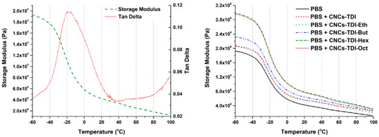 The dynamic mechanical analysis (DMA) results of the neat and reinforced PBS samples showing the glass transition temperature of PBS at around −17 °C (Left) and the effect of the surface modification of CNCs on their reinforcement capabilities (Right).