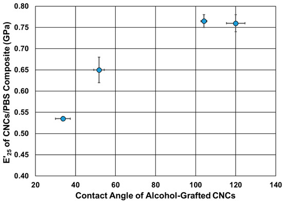 The impact of the alcohol-grafted CNCs on the thermomechanical behavior of PBS was studied using DMA (Figure 8). The storage modulus and glass transition temperature values of neat PBS are in agreement with the values in the literature [57] (Table 3). Upon the addition of the alcohol-grafted CNCs, an increase of up to two-fold in the storage modulus was observed, which was dependent on the chain length of the grafted alcohol. The storage modulus at 25 °C increased from 0.37 GPa to 0.52 GPa upon the addition of CNCs-TDI. Almost the same increase was observed upon the addition of CNCs-TDI-Eth. This indicates that the grafting of ethanol did not significantly change the surface properties of the CNCs as shown earlier in Figure 5. The modulus increased to 0.65 GPa using CNCs-TDI-But and reached a plateau at 0.77 GPa using either CNCs-TDI-Hex or CNCs-TDI-Oct. These results could be explained considering the contact angle of the alcohol-grafted CNCs (Figure 9). CNCs-TDI-Eth and CNCs-TDI-But were not hydrophobic enough to obtain an optimum interfacial adhesion with PBS. However, the surface properties of PBS seem to match those for CNCs-TDI-Hex and CNCs-TDI-Oct. Therefore, an alky chain length of six to eight seems to be needed for the formation of a hydrophobic shell around the CNCs and consequently improving the interfacial adhesion between PBS and the CNCs. In contrary to the storage modulus, the glass transition temperature (determined using DMA) and degradation temperature (determined using TGA) of PBS were not affected by the addition of any of these CNCs (Table 3).