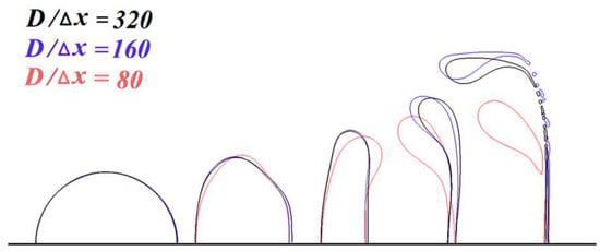 The contours of the droplet related to three numerical resolutions with D/Δx = 80, 160 and 320 are given in Figure 5, where Δx is the minimum grid size. The results demonstrate that the droplet deformation and breakup are nearly independent of the mesh size when the D/Δx is larger than 160. Therefore, the interface grid resolution of D/Δx = 160 is adopted to research the deformation and the fragmentation of the droplet in all of the following simulations.