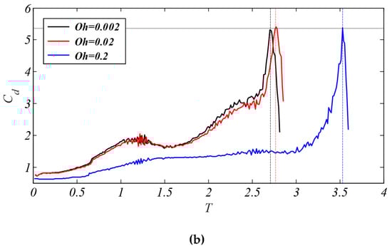 As shown in Figure 13b, the trend of droplet drag coefficient under different Oh numbers is the same as that in Figure 13a. However, when the bag breaks, the drag coefficient is close under the three cases (Oh = 0.002, 0.02, and 0.2). For the cases of Oh = 0.002 and 0.02, the evolution of the drag coefficient is basically in coincidence. According to the evolution of the kinetic energy, the increase of viscous force will have a slight effect on the droplet’s energy. As a result, the deformation of the droplet is similar when it is broken, causing the drag coefficient is so close. Additionally, with the Oh number increases, the growth trend of the droplet drag coefficient will slow down.