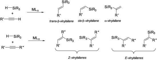 Hydrosilylation reaction is characterized by a wide range of substrates (compounds with multiple bonds) and reagents (silanes). The ability to control the yield of a particular isomer during the reaction by affecting the structure of the catalyst is one of the features of this reaction that distinguishes it from other processes in homogeneous organometallic catalysis. The general scheme of the hydrosilylation of alkynes is shown in Figure 2.